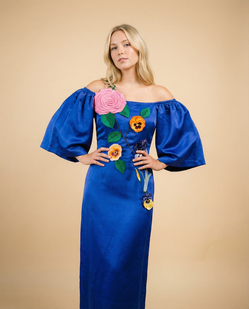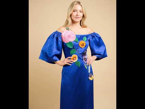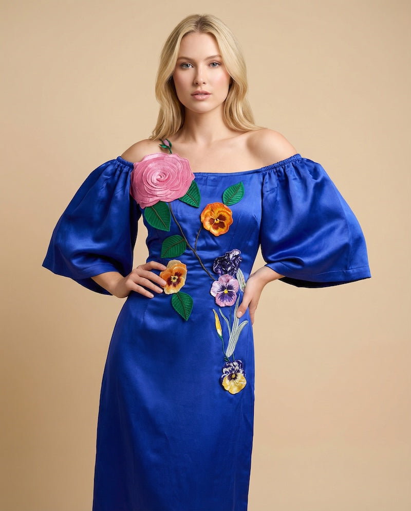 Command attention in our Royal Blue Off Shoulder Embroidered Maxi Dress — a handcrafted statement piece by Project Runway designer Sandhya Garg. Made from a premium viscose linen satin blend, this off-shoulder neckline designer maxi dress combines breathable comfort with a silky, fluid drape that moves beautifully with every step. The vibrant electric royal blue creates a bold yet timeless presence, while intricate handcrafted artisan embroidery adds refined texture and one-of-a-kind elegance.