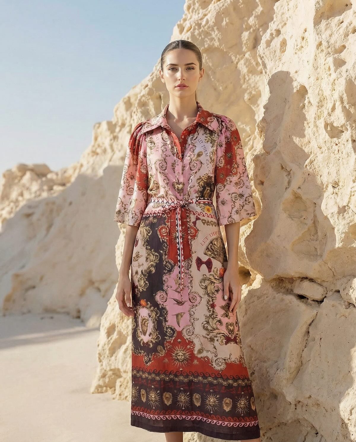 The Duchess was designed for occasions where you want to be the most interesting person in the room — not the loudest, but the one everyone asks "where did you get that?" Think: wedding guest dressing where you refuse to wear another safe navy midi. Summer outdoor weddings and destination beach ceremonies where the fabric breathes and the print photographs beautifully. Cocktail receptions and evening parties paired with statement earrings. Resort evenings at venues where the dress code says "dress to impress" and you take it personally. Anniversary dinners, milestone celebrations, and formal events where you want a conversation-starting piece that is not another sequin dress.