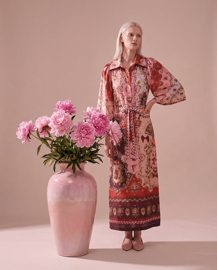 Most printed kaftans you will find online are mass-produced from generic fabric libraries. This one is not. The red-pink ornamental print on the Duchess is a Sandhya Garg original — hand-developed through sketching, painting, and digital refinement before being printed at her own facility. The heritage-inspired motifs draw from textile traditions Sandhya grew up around in India, reinterpreted through a modern lens for women who want their wardrobe to carry craft and story, not just a label.