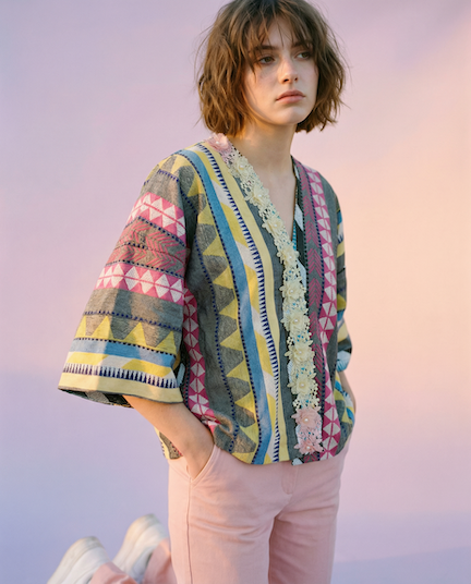 This women’s short kimono jacket is crafted in a beautifully textured cotton tapestry fabric, designed to bring color, artistry, and effortless polish to everyday dressing. Featuring a harmonious blend of soft pastel hues, geometric woven patterns, and delicate embroidered lace trim, this jacket strikes the perfect balance between contemporary fashion and artisanal detail.