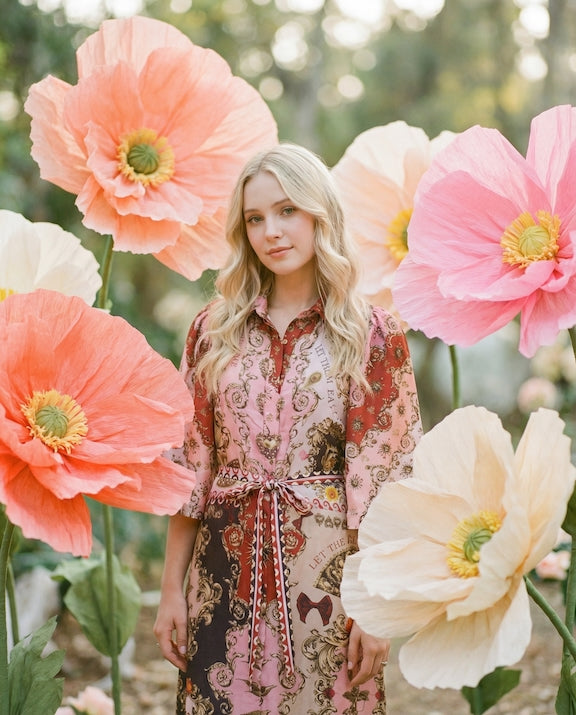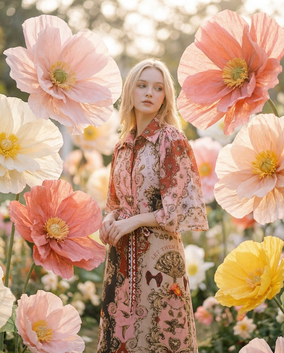This handcrafted print features intricate ornamental artwork inspired by heritage textile traditions, making each dress a wearable work of art.
